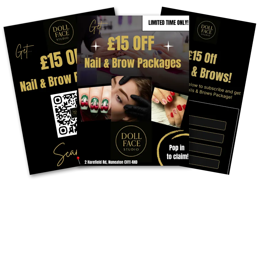 We handle customer capture, review requests, and SMS follow-up — and design everything that supports it, from landing pages and QR codes to in-store flyers and promotional materials.
